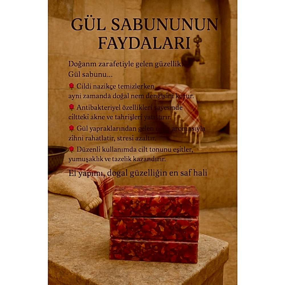Rose soap is renowned for bringing a feeling of softness to the skin. It is known that the thick foam relaxes the capillary vessels under the skin and relieves redness of the skin, signs of fatigue and aging. It is known that the skin moisturizes, nourishes and gives the skin a bright and vibrant appearance.